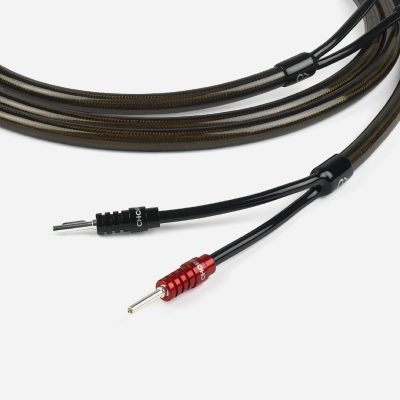 Our Epic X speaker cables are factory terminated with Chord Company ChordOhmic 4 mm banana plugs or spades, or a combination of the two, neatly finished with new cable “trousers”. Custom lengths and single cables are available on request.