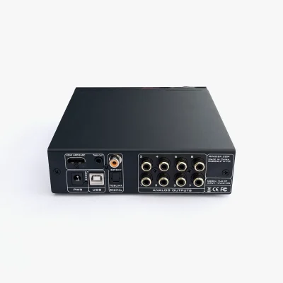 Eight channel audio input is via linear PCM over HDMI eARC or USB Audio. Coaxial and optical S/PDIF provide additional stereo inputs. The eight channel analogue RCA outputs feature class-leading low noise and distortion figures.